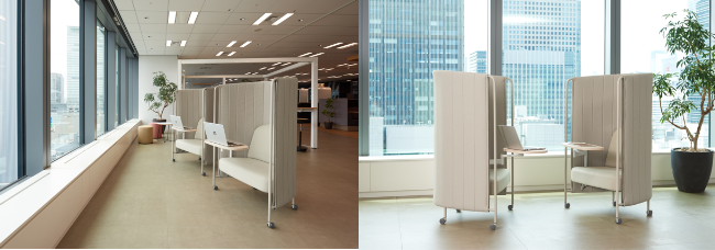 インセイルは、フレキシブルにレイアウトを可変できる機動性を備えたワークソファです。ソファを囲うファブリックのパネルを備えることで周囲の視線を遮り、フォーカスワークをサポートします。キャスター付きのため、ワンアクションでコミュニケーションのレイアウトに変えることができます。各々の作業に最適な空間をワーカー⾃⾝が選択しながらお使いいただける商品です。