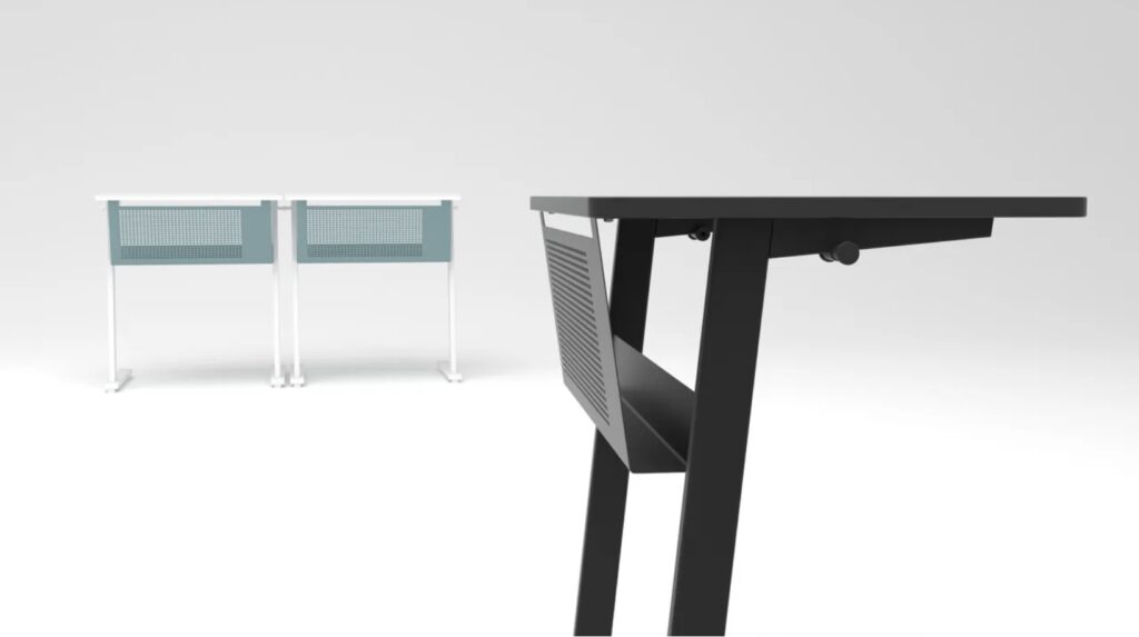 スリムながらもゴシック感のあるデザインは単体のみならず複数のレイアウトにおいてクリエーティブな空間を演出することができます。従来の講義デスクと同様のパーツ数にて多機能化を実現しているため、シンプルなデザインに落ち着いています。それ故に多様化する授業形態での様々なレイアウトに対応し、洗練された豊かなスペースを提供することができます。また、連結するレイアイアウトの際、脚の内側からも使用できる可動フック(特許出願中)のデザインを実現しました。 一枚のスチールプレートからなるラック付き幕板はシンプルな構造でありながら強度メンバーとしても成り立たせています。 最少パーツにて構成されたデザインはエコフレンドリーなデザインを実現しています。
