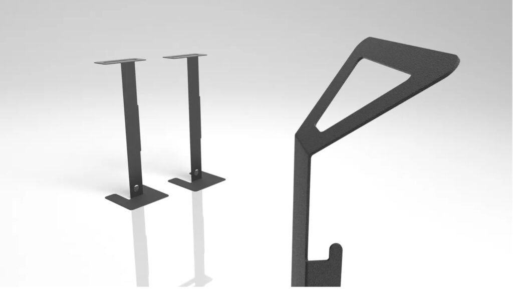 ベース・支柱・ハンドル・ケーブルフックすべてを、一枚のスチールプレートを切欠きと折り曲げのみで実現しています。機器としての機能は一般市販品を利用するので、将来にわたって給電設備や通信機器のポートが変更されても永続的に使用することができます。スリムなスタッキング機能も備えているので収納力も高く、頻繁なレイアウト変更など、柔軟なコミュニ ケーションスペースの活用を可能にしています。 また、上部のデザインは、持ち運びやすいハンドルデザインとなっており、単体の設置タイプとテー ブルの天板サイドに設置するタイプを用意していおり、シンプルでミニマルなスタイリングが現代のインテ リアにもマッチしています。