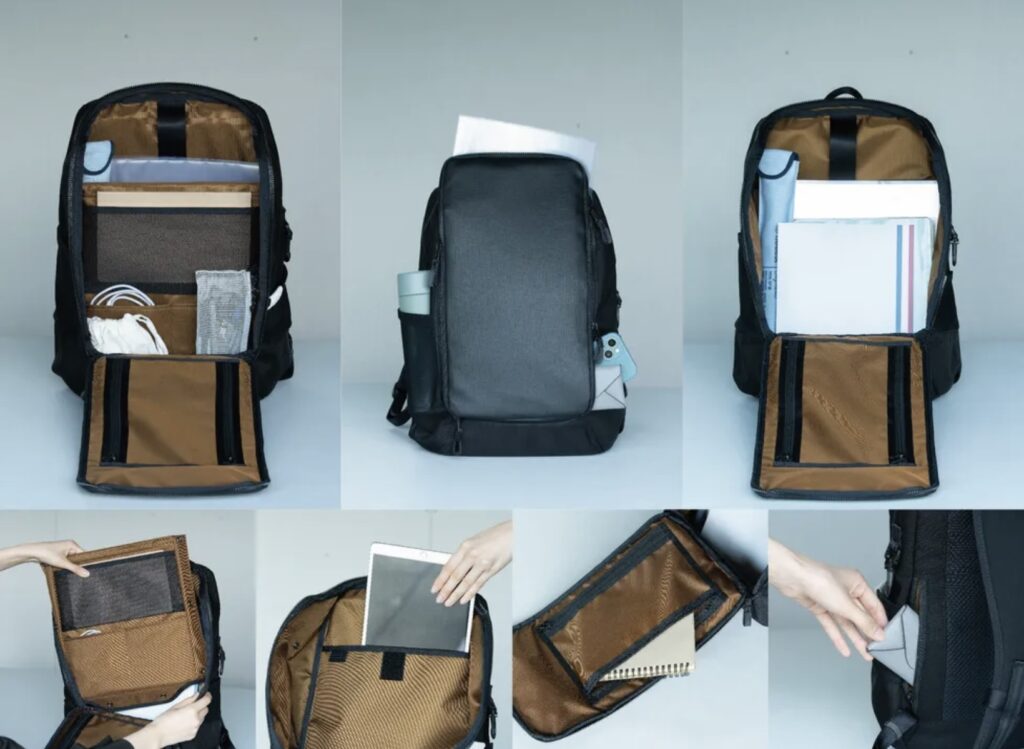 カブセにはファスナーの取手が4つついているので、上と左右からもアクセスができます。カブセ裏のポケットは、左右にチャックがついているので、どちらからも収納できます。背面右下には、隠しポケットがあり、小さめのお財布等を収納できます。