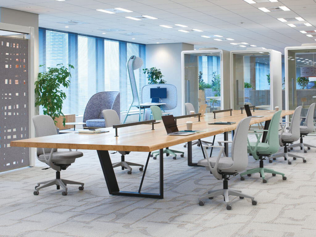 リモートワークとオフィスワークを組み合わせた働き⽅「ハイブリッドワーク」により、ワーカーは⾃らの業務に最適な環境を選んで働くことが主流になっています。そういった背景の中でオフィスは「オフィスでしか得られない価値」が求められており、リモートワークではできない「フォーカスワーク」や「リアルなコミュニケーション」などの環境を充実させていくことが重要だと考えます。加えて、リモートワークの導⼊によりオフィスレイアウトを固定してしまうことに対する不安を抱くお客様が⼀定数おられ、「多⽤途に使⽤できる空間づくり」や「フレキシブルにレイアウトを可変できる」ということもこれからのオフィスで重要なポイントだと考えます。