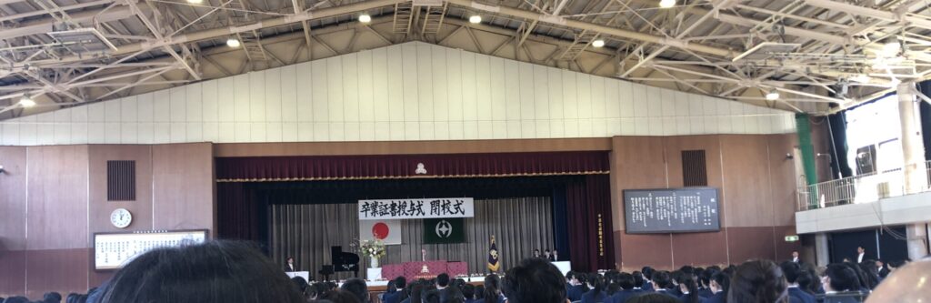 「閉校式」が始まりました。卒業した人たちは退場させないのかな、と少し疑問に思いましたが、その理由は