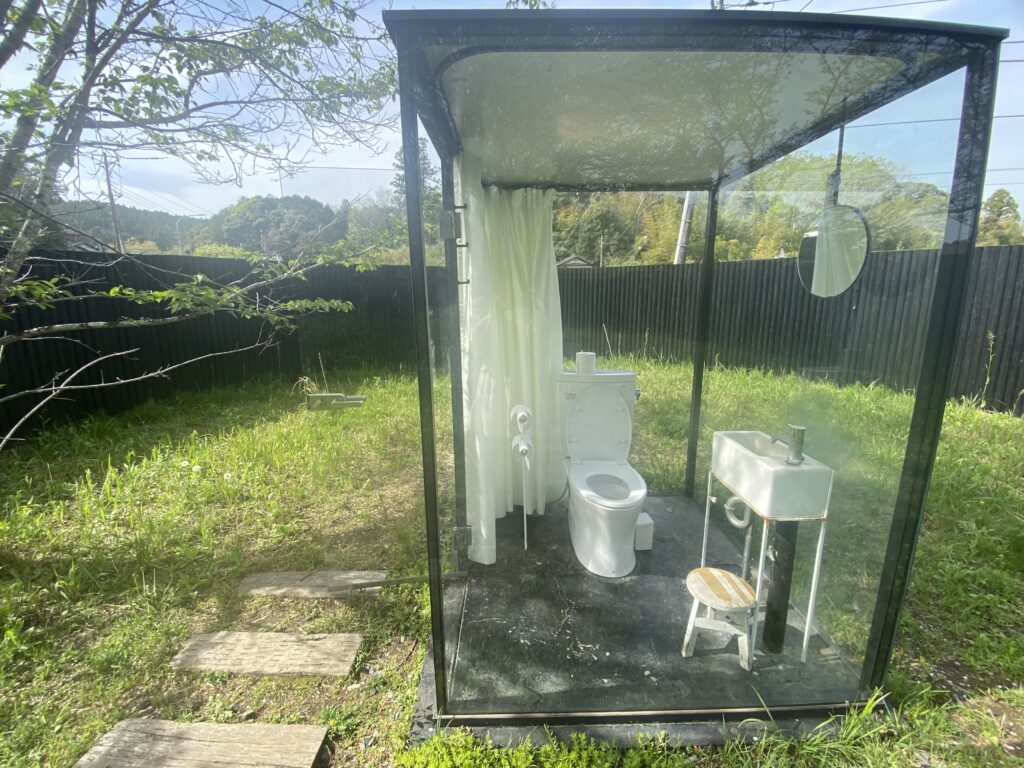 飯給駅には藤本壮介(ふじもと そうすけ)氏が設計した「Toilet in Nature」という、女性専用のトイレがあります。緑あふれる広い敷地に、ポツンと立つガラス張りのボックス。無機質なガラスと周囲の草花が融合し、アートとしての存在をしっかりと主張しているのがなんとも不思議です。世界一大きなトイレと話題を集め、飯給駅のあらたなスポットとなりました。