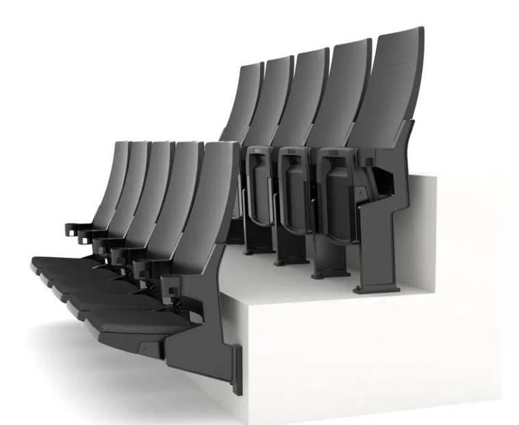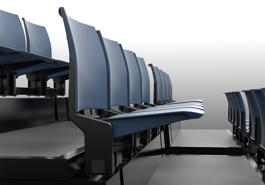 現代的なホール空間にマッチするシンプルでスリムなデザインにリファインした移動観覧席です。昨今のホールや体育館ではイベントの多様化や体感型のアミューズメント性が求められていることから、様々な空間に調和するシンプルなデザインと曲線の美しい形を追及するとともに、選択可能な独立肘やパッド、カップホルダー等の居住性を向上するユーティリティーを選択的に装備可能なデザインとしました。
