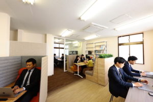 中央のソファ席は、適度な囲われ感と、リラックス感があるので、緊張感なく、会話をすることができます。お茶を飲みながら会話をしたり、リラックスした気分で、コミュニケーションが活性化しやすくなります。チームミーティングはここのソファ席で行うことが多いです。