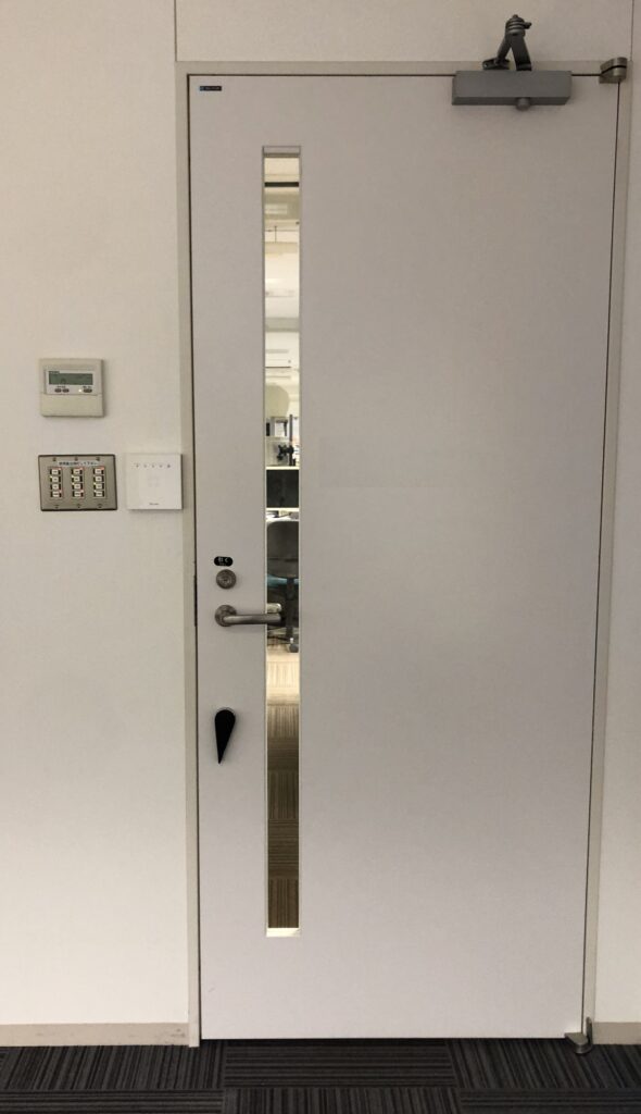 電気錠は、扉内側を通線することで、扉のなかに電気錠のケーシングを入れ、その錠によって扉を