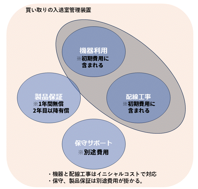(イニシャルコストは、扉の状況等により変わりますので、一度お問合せください。もちろん、配線等が短いので一般的な買取の入退室管理システムよりはかなり安く済みます。)