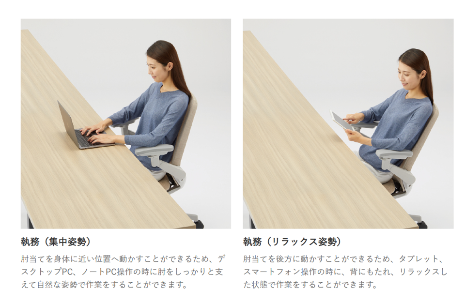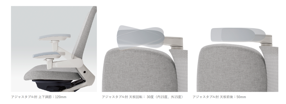 アジャスタブル肘は、上下、左右、前後に肘の位置を調整することができるもので、作業姿勢に合わせて腕を支えることにより、疲労を軽減します。