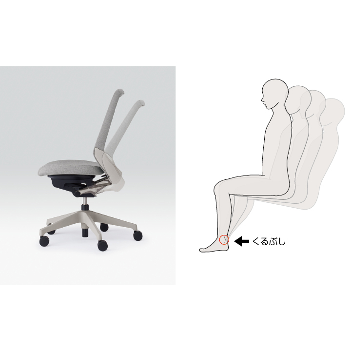 くるぶしを支点に背と座の角度が連動して傾き、背の最後傾角度は20度まで可能です。またロッキングの角度をお好みの場所で固定できるシートアングルストッパー付です。