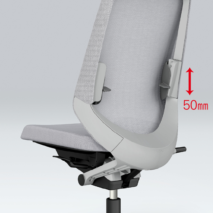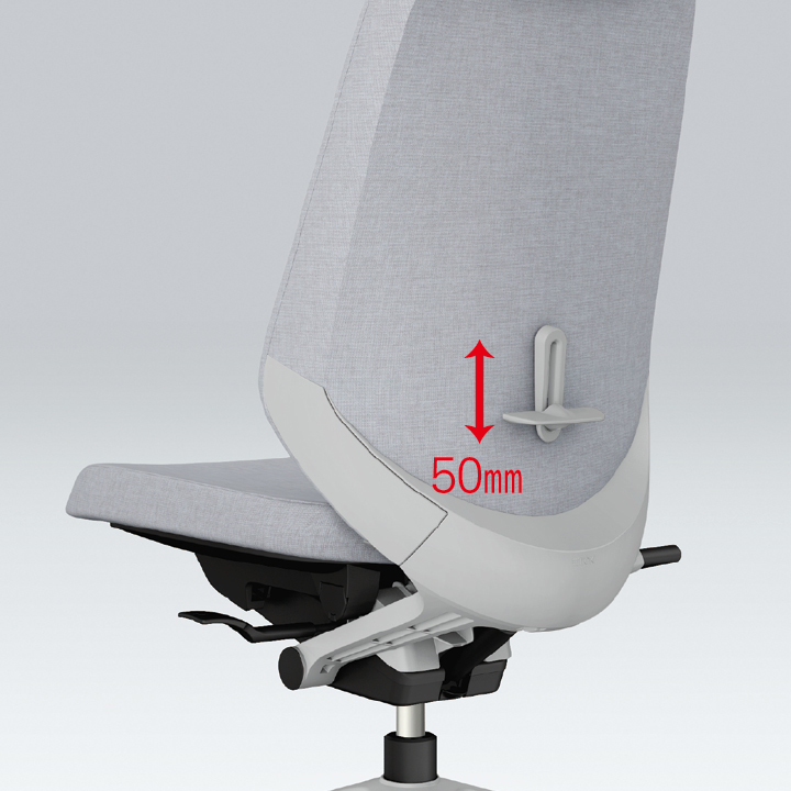さらに、座面下のレバー操作により、座面を50mmのストローク(16.7mmピッチ)で好みの位置に調節できます。体格や作業姿勢に合わせたポジション設定を行うことができます。