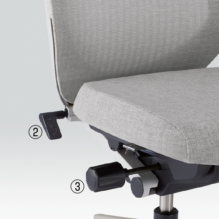 ①ガス上下調節:レバー操作により座面の高さ調節が行えます。②シートアングルストッパー:ロッキングの角度をお好みの場所で固定できます。③ロッキング強弱調節:体格や好みに合わせて、ロッキングの強弱を無段階で調節できます。